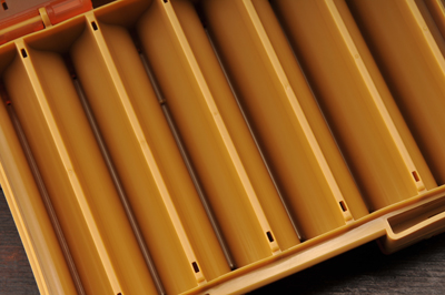 対面トライアングル構造のルアーケースです。水抜き穴と通気孔がついています。32mmの深さがあり、やや体高のあるルアーも収納できます。